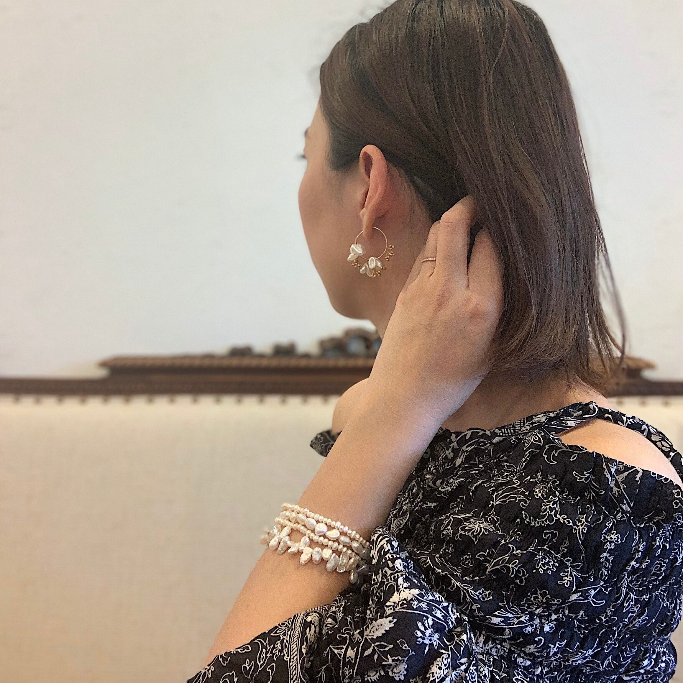 パールが顔まわりを華やかにしてくれ、ゴールドビーズがアクセントになって、表情を引き締めてくれます。