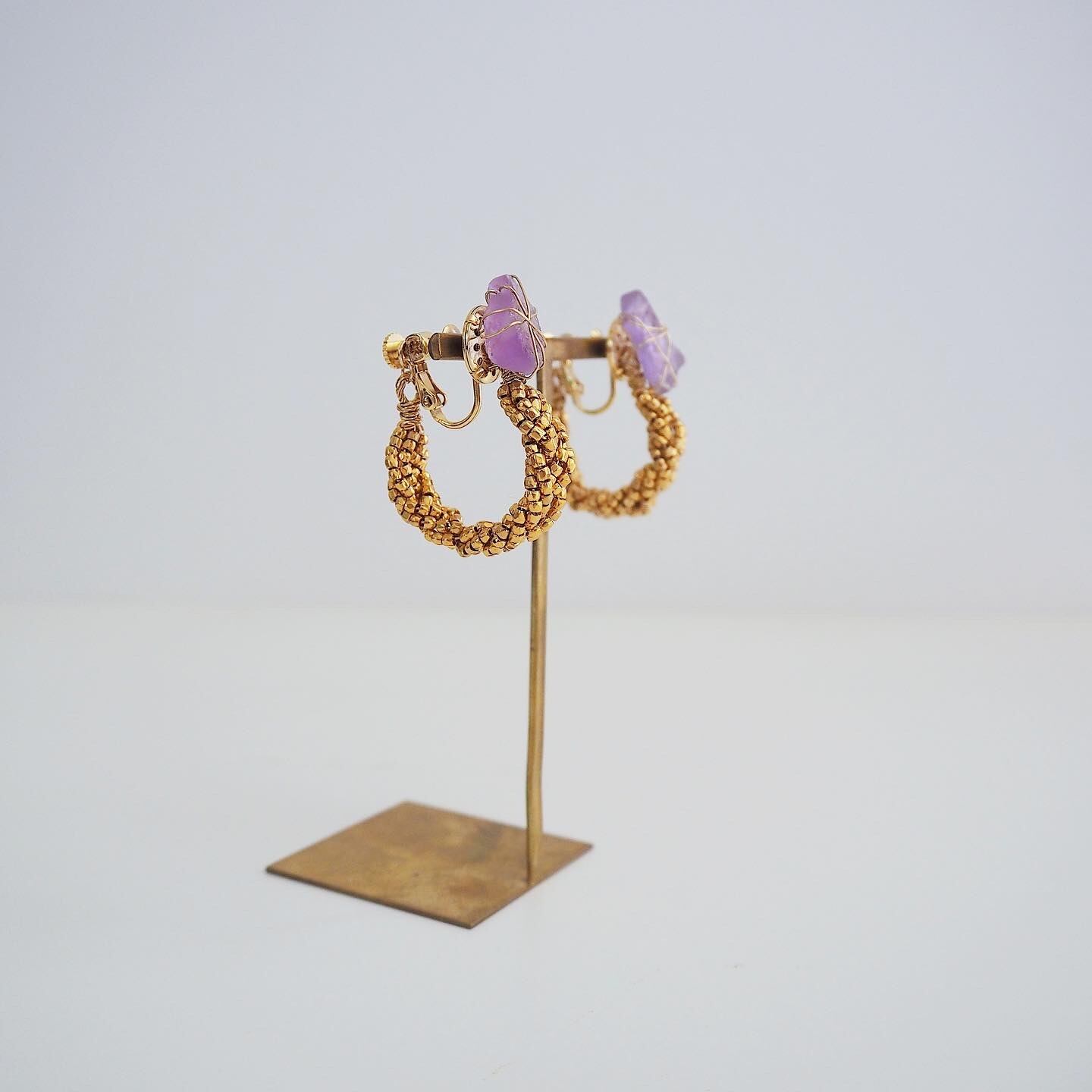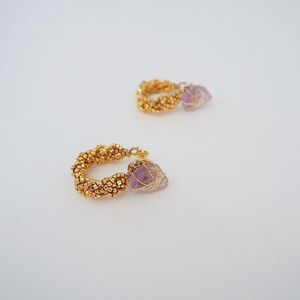 ビーズで三つ編みを施した、コロンとした小さめのフープに、アメジストとシトリンが混ざり合ったバイカラーの石、アメトリンをポイントにしました。