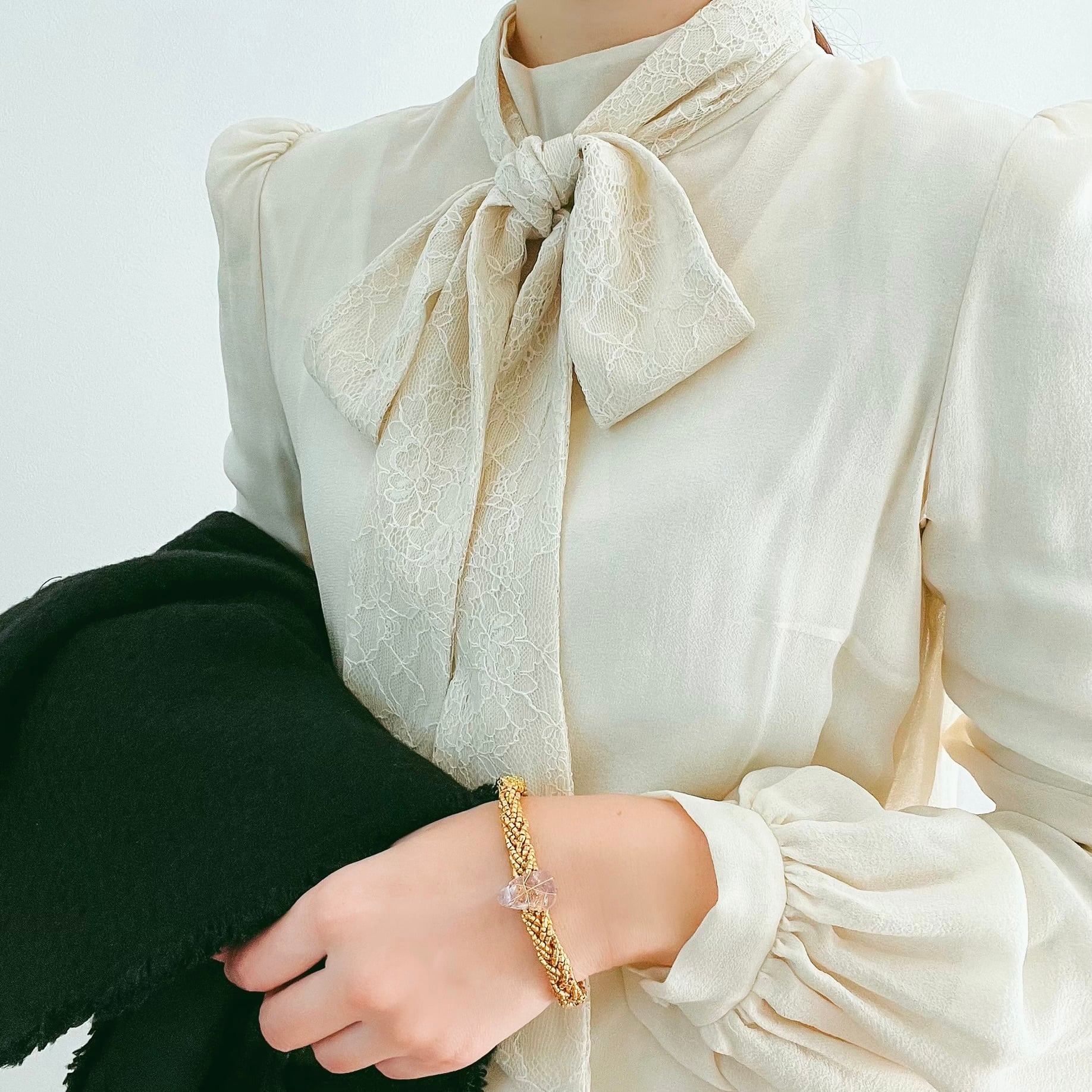 ビーズで三つ編みを施した程よい太さのバングルに、アメジストとシトリンが混ざり合ったバイカラーの石、アメトリンをポイントにしました。